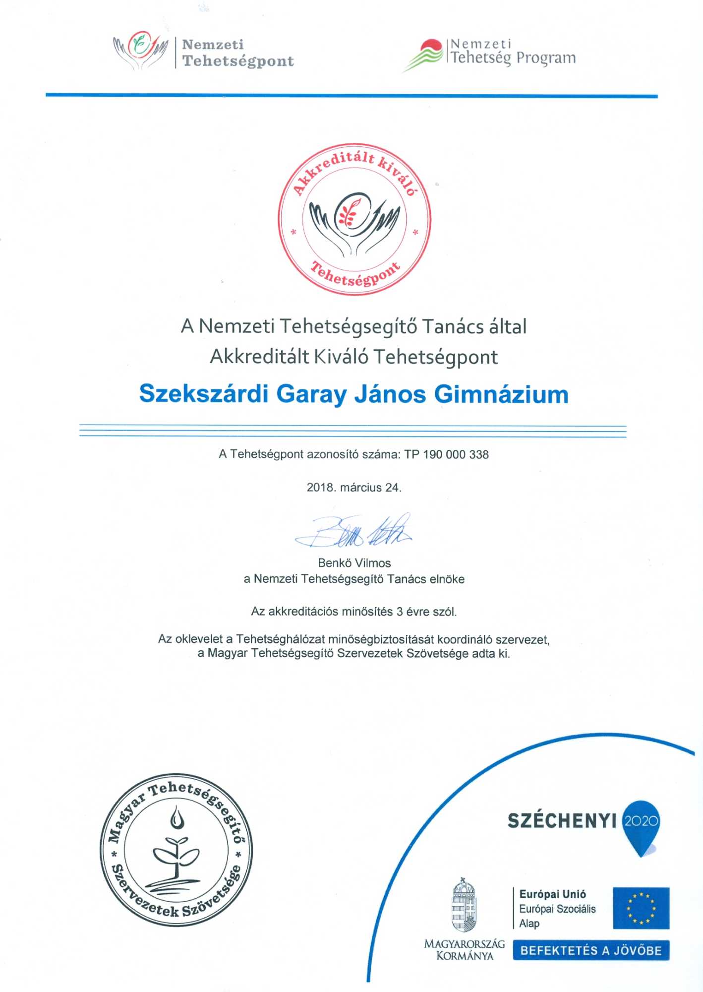 A Nemzeti Tehetségsegítő Tanácshoz benyújtott sikeres pályázatunk értelmében intézményünk Akkreditált Kiváló Tehetségpontként működik.
